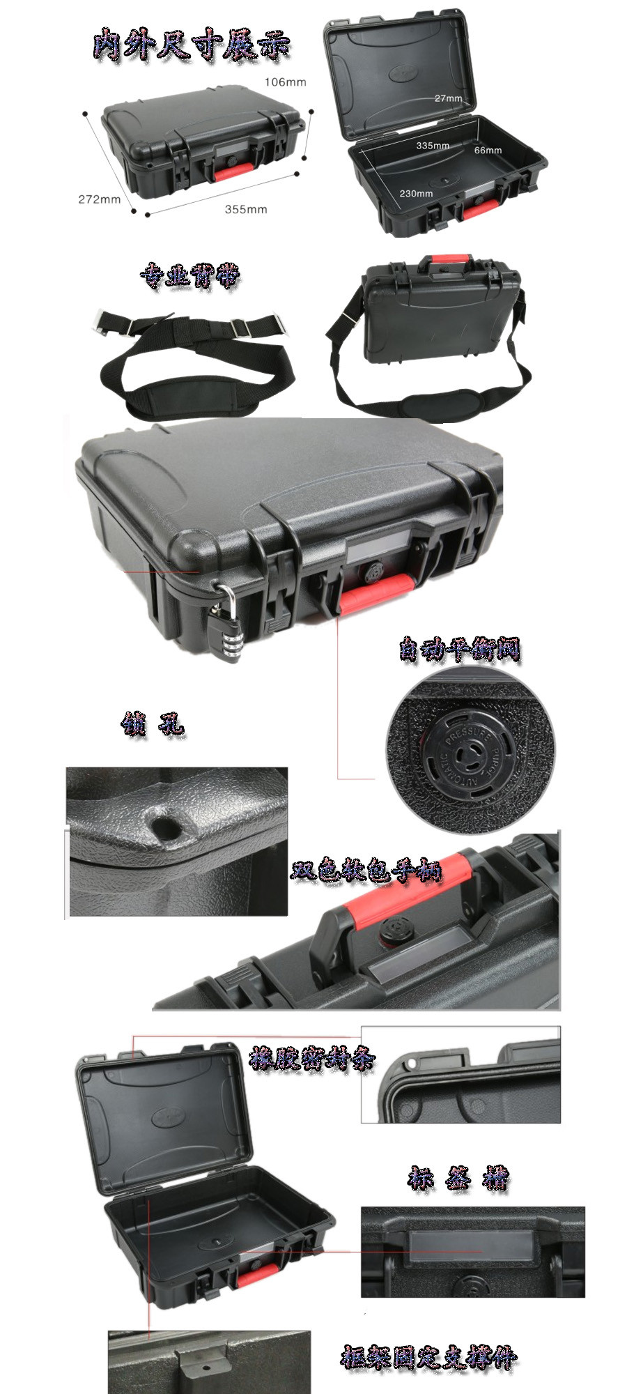 簡要說明:廣泛用于傳媒、公安、消防、軍隊、航空、戶外攝影、野外考察、科學探測等眾多領域的高端儀器、儀表。具有高強度、高抗壓沖擊、防潮、絕對密封、防塵、防水等特點。產(chǎn)品材質(zhì):ABS原料,箱體采用高抗沖擊的高分子聚合材料一體注塑成型,密封采用扁型彈性發(fā)泡密封橡膠條,確保防水氣密,所有較軸均采用不銹鋼材質(zhì)。