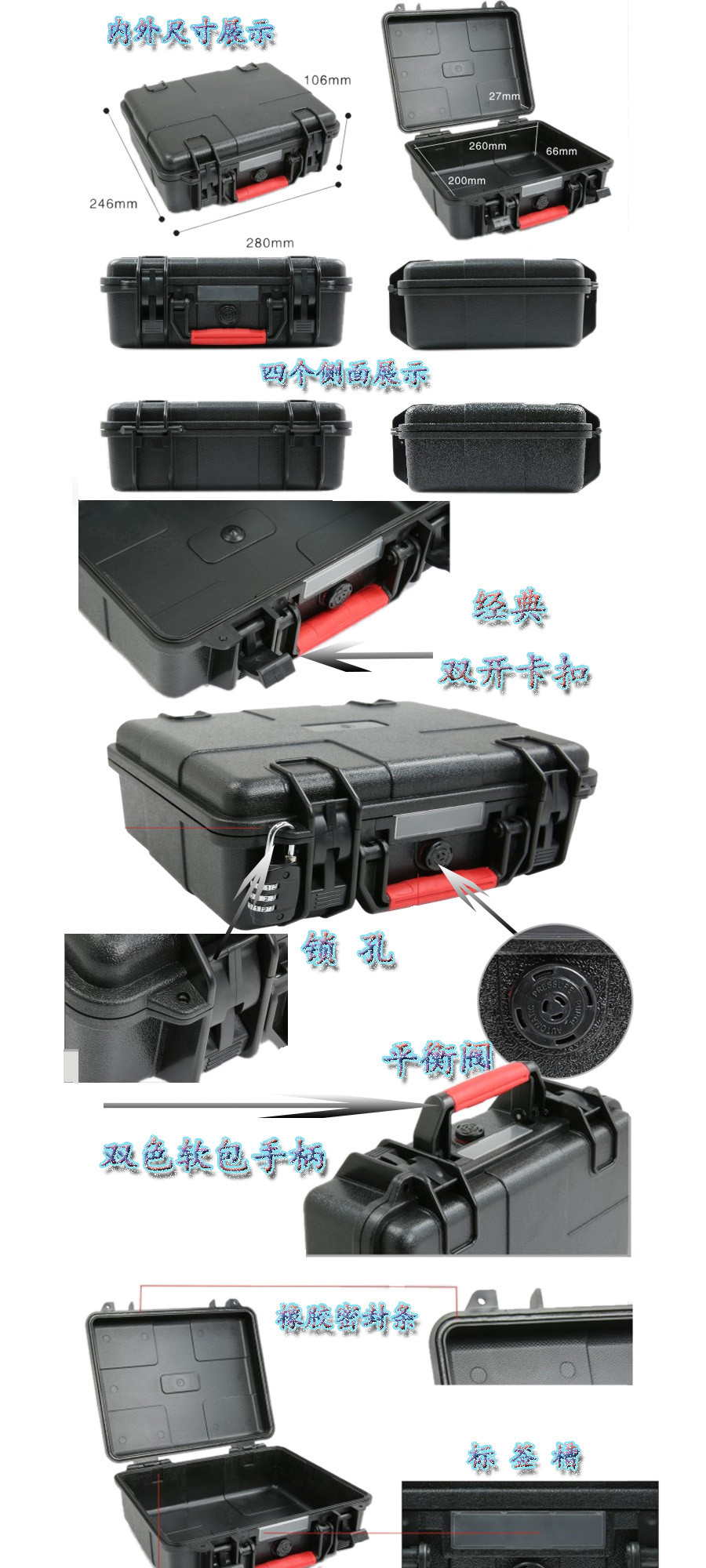 簡(jiǎn)要說明:廣泛用于傳媒、公安、消防、軍隊(duì)、航空、戶外攝影、野外考察、科學(xué)探測(cè)等眾多領(lǐng)域的高端儀器、儀表。具有高強(qiáng)度、高抗壓沖擊、防潮、絕對(duì)密封、防塵、防水等特點(diǎn)。產(chǎn)品材質(zhì):ABS原料,箱體采用高抗沖擊的高分子聚合材料一體注塑成型,密封采用扁型彈性發(fā)泡密封橡膠條,確保防水氣密,所有較軸均采用不銹鋼材質(zhì)。