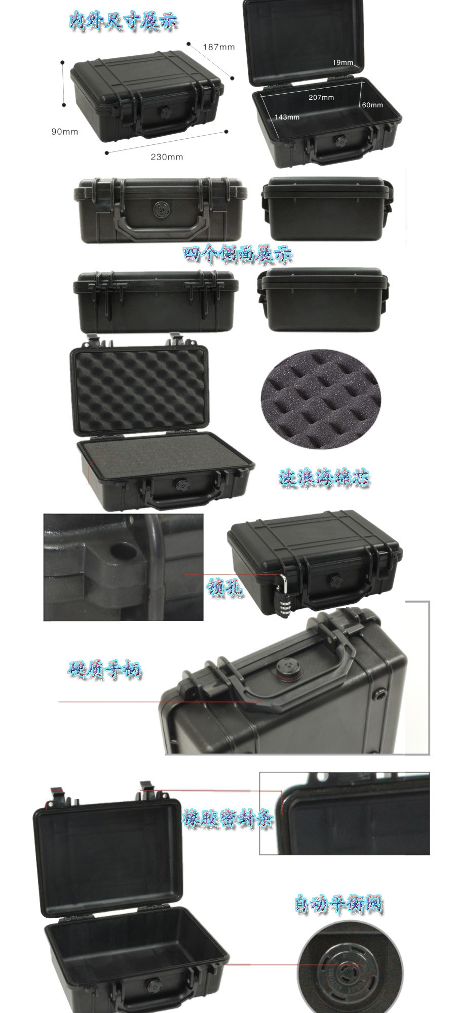 簡要說明:廣泛用于傳媒、公安、消防、軍隊、航空、戶外攝影、野外考察、科學(xué)探測等眾多領(lǐng)域的高端儀器、儀表。具有高強(qiáng)度、高抗壓沖擊、防潮、絕對密封、防塵、防水等特點(diǎn)。產(chǎn)品材質(zhì):ABS原料,箱體采用高抗沖擊的高分子聚合材料一體注塑成型,密封采用扁型彈性發(fā)泡密封橡膠條,確保防水氣密,所有較軸均采用不銹鋼材質(zhì)。